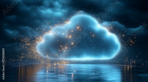 A luminous cloud with golden sparkles above reflective water against a dark sky