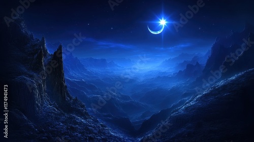 A luminous crescent moon illuminates a dark blue mountain landscape. Ideal for fantasy book covers or music album art.