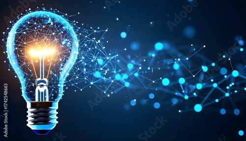 A luminous lightbulb symbolizing innovation and ideas, surrounded by a futuristic digital network of interconnected nodes.