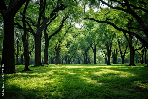 A lush forest filled with tall trees allows sunlight to pour through the leaves creating a serene atmosphere on a warm afternoon