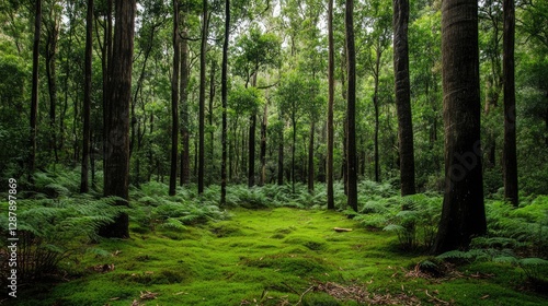 A lush forest with tall trees and a carpet of ferns and moss covering the forest floor.