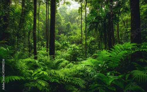 A lush forest with tall trees, vibrant green plants, and clean air, promoting sustainability and ecology