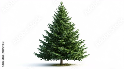 A lush green evergreen tree standing tall against a white background.