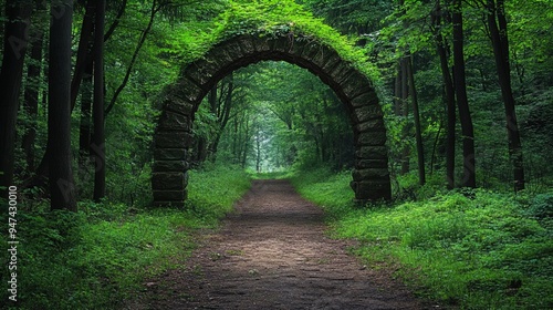 A lush, green forest path leads into the distance under a beautiful stone archway. The arch, made of roughly hewn stones, is covered with moss and surrounded by tall trees with verdant foliage. The di