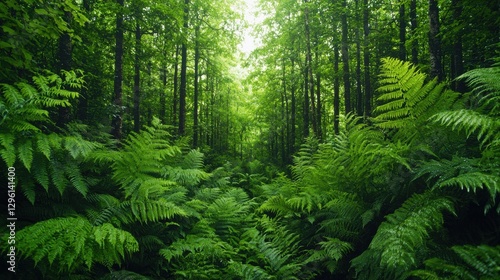 A lush, green forest with ferns and tall trees, creating a serene and tranquil atmosphere, illuminated by soft, diffused light.