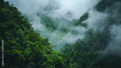 A lush green forest with misty clouds and a rocky cliff in the background.
