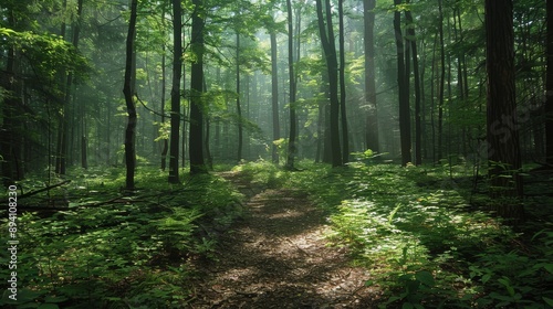 A lush green forest with sunlight filtering through the trees and a peaceful trail