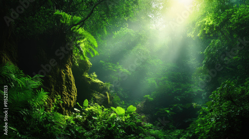 A lush green forest with sunlight shining through the trees