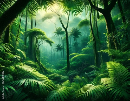 a lush green jungle with tall trees and a thick canopy of leaves generative ai image