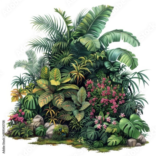 A lush rainforest garden, garden arrangement, realistic painting, rich greens, isolated on white background