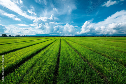 A lush rice paddy field with neat, under a bright, sunset sky, green rows stretching