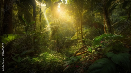 A lush tropical forest landscape, capturing the vibrant greenery and diverse flora of the region, created by AI.