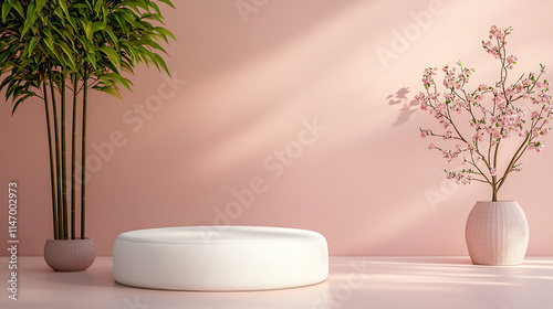A luxurious 3D display podium with elegant feminine design elements, showcasing a high-end product in a beautifully lit 3D render for an advertisement.