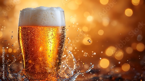 A luxurious beer pour, golden liquid splashing into a glass, foam overflowing slightly, ultra-detailed bubbles rising, warm glowing background, condensation forming on the glass,
