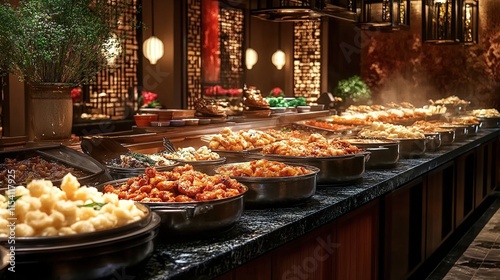 A luxurious Chinese buffet with an array of mouthwatering dishes, including chicken in brown sauce and rice cakes.