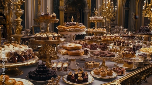 A luxurious dessert display with a variety of pastries and chocolates, styled with fine china and linen in an elegant banquet hall.