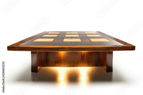 A luxurious, illuminated wooden conference table with a sleek, modern design and inlaid glass top.