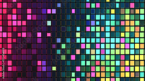 A luxurious mosaic plot with glowing tiles in radiant neon gradients, dynamically arranged on a polished black grid, creating a high-end, futuristic data visualization with depth and elegance.
