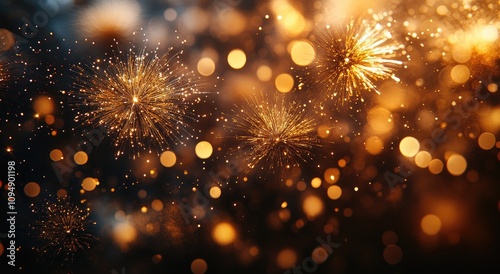 A luxurious New Year's background featuring vibrant fireworks and golden bokeh lights, creating an elegant and festive atmosphere, ideal for New Year’s Eve party invitations, event flyers, cards