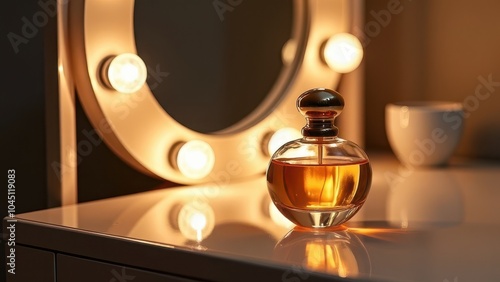 A luxurious perfume bottle placed on a marble vanity in a dimly lit bathroom, with soft warm lighting and a decorative mirror in the background