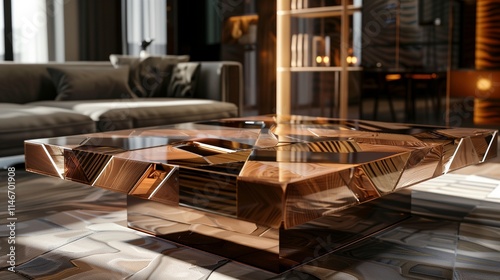 A luxury coffee table made from polished wood and glass, with intricate metallic inlays, isolated in a contemporary setting.