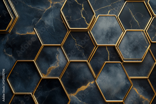 A luxury-inspired 3D background featuring a seamless arrangement of gold-edged hexagonal tiles with deep black marble textures. The glossy reflections and premium material combination create a