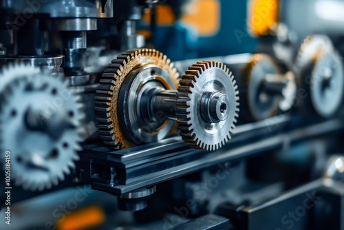 A machine with many gears is shown in a factory. Concept of industrial production and efficiency