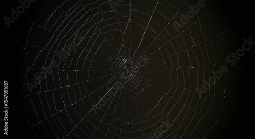 A macro closeup reveals an intricate spiderweb glistening with morning dew drops, a perfect natural trap designed by the arachnid