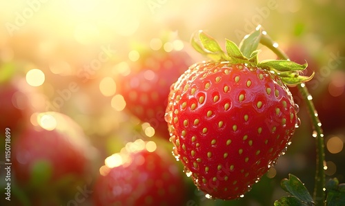 A macro image focusing on the texture of strawberries, with the early morning sun