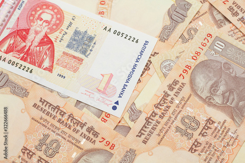 A macro image of a red and white Bulgarian lev bank note with Indian ten rupee bank notes
