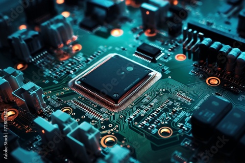 A macro image of an electronic circuit board, with a multitude of parts and a prominent central processing unit. Created with generative AI tools