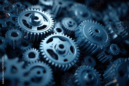 A macro image of many overlapping, metal gears with a blue-grey hue