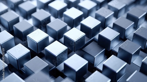 A macro perspective presents numerous geometric cubes arranged closely, forming a modern, architectural composition. The metal blocks create a compelling visual texture.