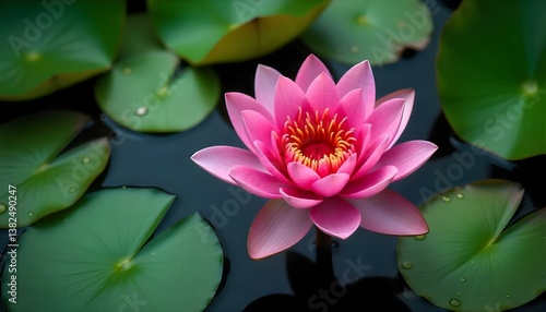 A macro shot captures a vibrant pink water lily in full bloom, set against a backdrop of lush green lily pads floating on dark water