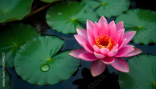 A macro shot captures a vibrant pink water lily in full bloom, set against a backdrop of lush green lily pads floating on dark water