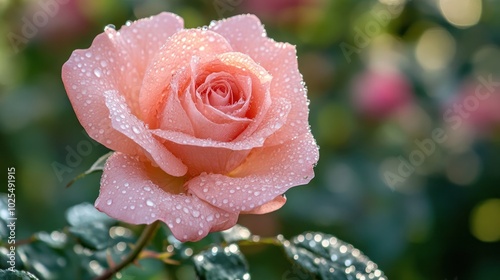 A macro shot of a delicate pink rose, covered in morning dew, highlighting the intricate layers of petals and soft, natural lighting