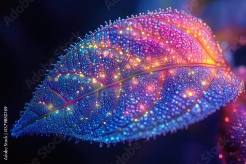 A macro shot of a leaf adorned with glowing, colorful specks against a dark background.