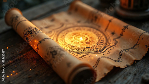 A macro shot of a magic scroll, with glowing ink and ancient symbols, partially unraveling under a soft light.