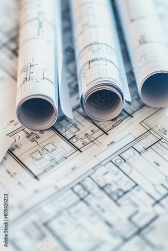 A macro shot of architectural blueprints rolled up and arranged in a flat lay AI generated illustration