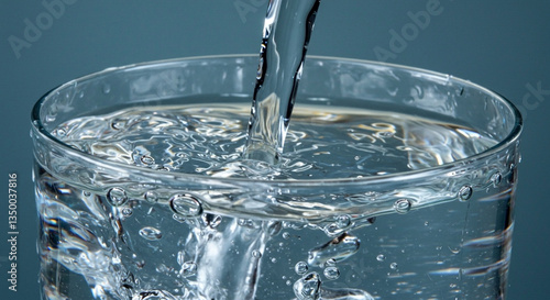 A macro shot of clear water being poured into a glass, with bubbles and ripples in focus.