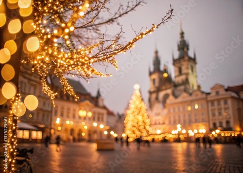 A magical Christmas Eve in Prague's Old Town Square, twinkling lights adorning a tree and buildings, creating a warm, festive atmosphere with a soft focus and golden glow.