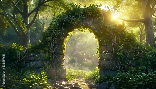 a magical forest gate made of stone, vines and leaves in the middle of an enchanted green fantasy landscape with sunlight shining through the trees
