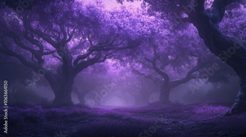 A magical forest with purple trees and fog. The trees have twisted branches and create a mysterious atmosphere. The fog adds to the sense of mystery and the purple light makes it look magical.