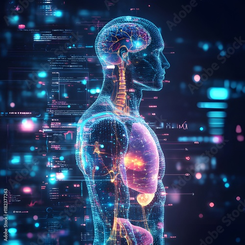 A magical illustration of the human body in profile, with glowing organs and a holographic overlay of medical data, showcasing futuristic healthcare and science