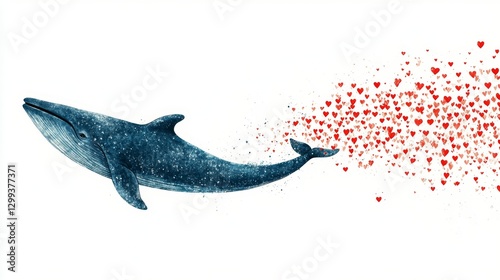 A magnificent deep blue whale soaring through the sky, leaving behind a trail of floating red hearts in a romantic and surreal scene