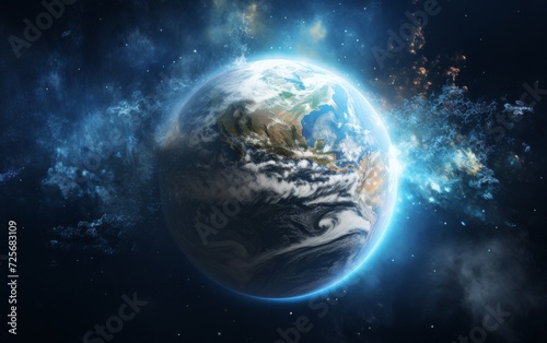 A magnificent sphere suspended in the vastness of outer space, its swirling clouds and shimmering stars evoking a sense of wonder and awe at the grandeur of the universe