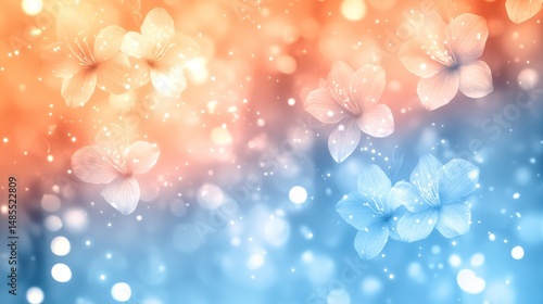 A magnified view of several flowers on a white and blue background, emphasizing a bright yellow and orange flower that takes center stage