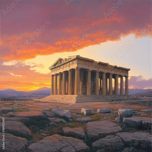 A majestic ancient temple stands against a vibrant sunset sky, surrounded by rocky terrain, showcasing classical architecture and historical significance.