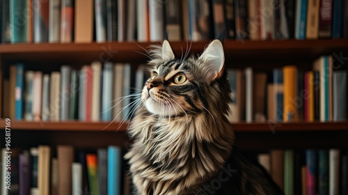 A majestic cat sits gracefully in front of a bookshelf, exuding curiosity and elegance.