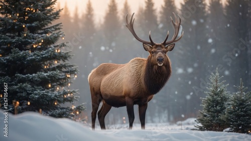 A majestic elk stands in a snowy landscape, surrounded by evergreen trees and soft snowfall.